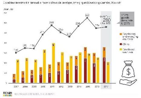 但對(duì)新增可再生能源發(fā)電的投資已超過(guò)對(duì)新增化石燃料和核能發(fā)電投資總和的兩倍以上。 由于成本競(jìng)爭(zhēng)力的提高,2017年可再生能源投資占電力行業(yè)總投資的比例超過(guò)三分之二,同時(shí)可再生能源在電力行業(yè)的份額仍將會(huì)繼續(xù)上升。