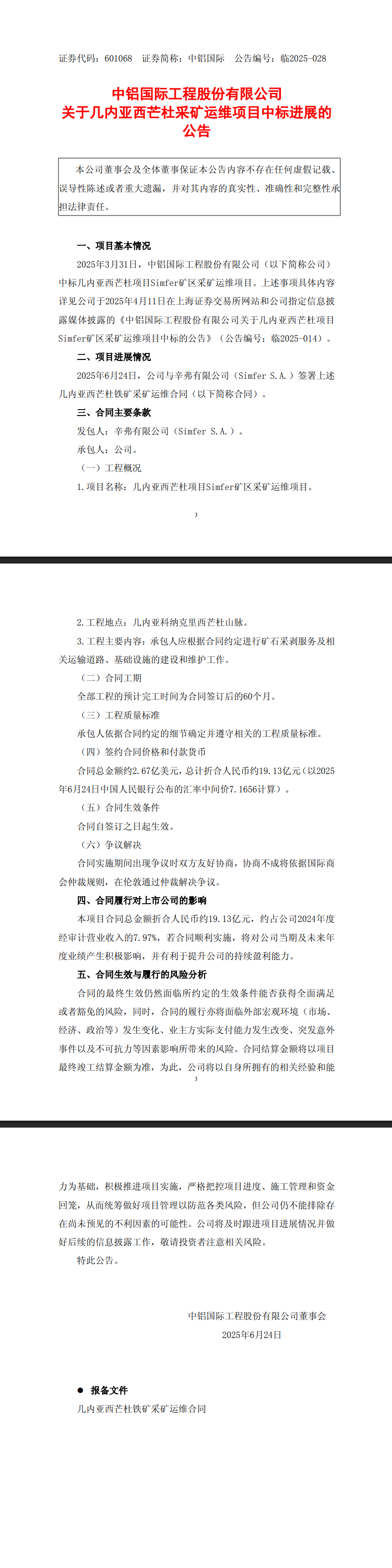 發(fā)包方為辛弗有限公司(Simfer S.A.),承包方為公司。項(xiàng)目名稱為幾內(nèi)亞西芒杜項(xiàng)目Simfer礦區(qū)采礦運(yùn)維項(xiàng)目,工程地點(diǎn)位于幾內(nèi)亞科納克里西芒杜山脈,主要內(nèi)容包括礦石采剝服務(wù)及相關(guān)運(yùn)輸?shù)缆?、基礎(chǔ)設(shè)施的建設(shè)和維護(hù)。合同工期為簽訂后60個月,工程質(zhì)量標(biāo)準(zhǔn)按合同約定執(zhí)行。簽約合同總金額約2.67億美元,折合人民幣約19.13億元(以2025年6月24日中國人民銀行公布的匯率中間價7.1656計(jì)算),合同自簽訂之日起生效。爭議解決方式為友好協(xié)商,協(xié)商不成則依據(jù)國際商會仲裁規(guī)則在倫敦仲裁。