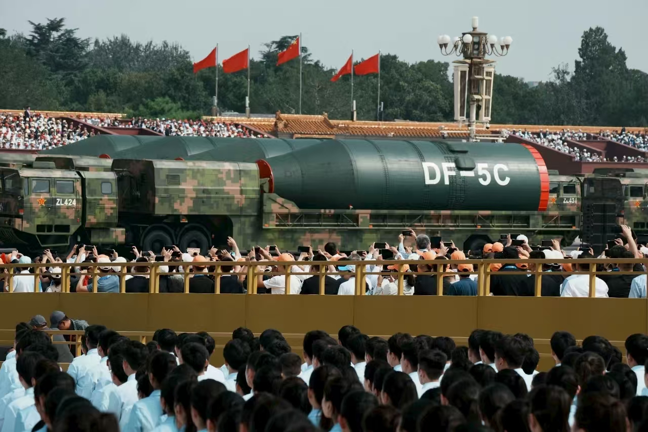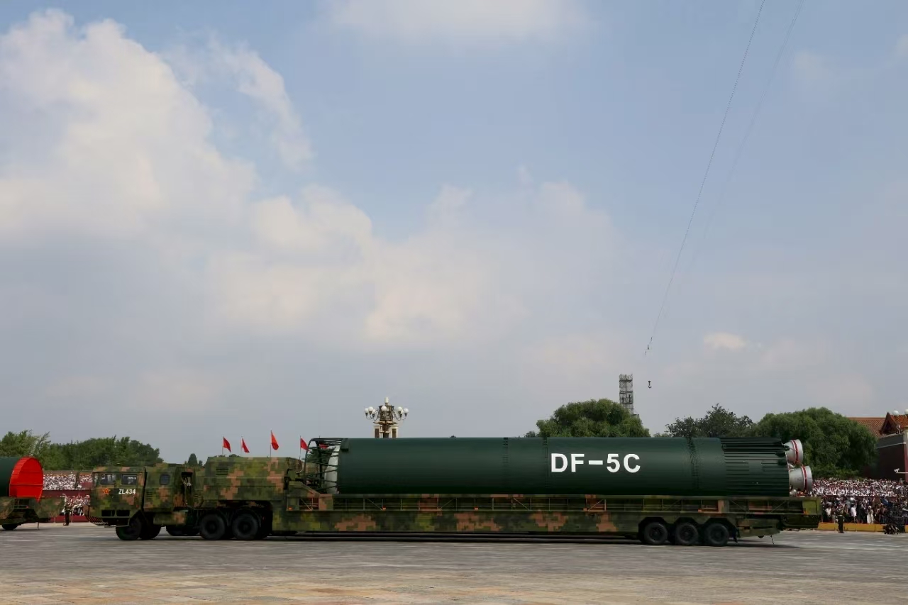 12臺大型導(dǎo)彈運(yùn)輸車載著“東風(fēng)-5C”液體洲際戰(zhàn)略核導(dǎo)彈浩蕩而來。核導(dǎo)彈第二方隊(duì)是裝備方隊(duì)壓軸出場的方隊(duì)。“東風(fēng)-5C”液體洲際戰(zhàn)略核導(dǎo)彈是我國戰(zhàn)略反擊體系中的重要組成,打擊范圍覆蓋全球,全時(shí)戒備、有效威懾,以武止戈、砥定乾坤。方隊(duì)由火箭軍某基地牽頭抽組。