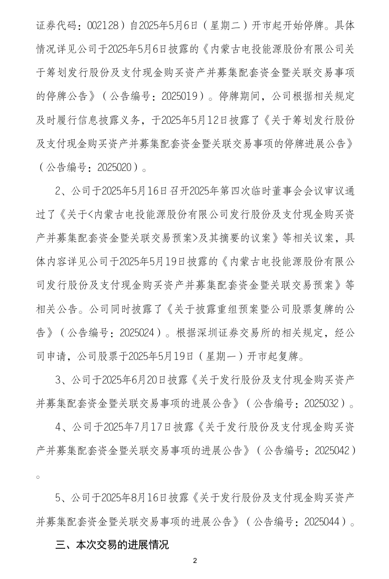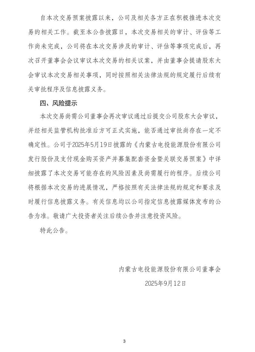 自本次交易預(yù)案披露以來(lái),電投能源及相關(guān)各方正在積極推進(jìn)本次交易的相關(guān)工作。截至本公告披露日,本次交易相關(guān)的審計(jì)、評(píng)估等工作尚未完成,電投能源將在本次交易涉及的審計(jì)、評(píng)估等事項(xiàng)完成后,再次召開(kāi)董事會(huì)會(huì)議審議本次交易的相關(guān)議案,并由董事會(huì)提請(qǐng)股東大會(huì)審議本次交易相關(guān)事項(xiàng),同時(shí)按照相關(guān)法律法規(guī)的規(guī)定履行后續(xù)有關(guān)審批程序及信息披露義務(wù)。