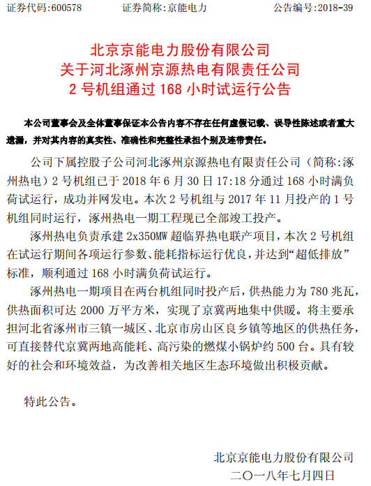 京能電力發(fā)布公告,下屬控股子公司涿州熱電2號機組已于6月30日17:18分通過168小時滿負荷試運行,成功并網(wǎng)發(fā)電。本次2號機組與2017年11月投產(chǎn)的1號機組同時運行,涿州熱電一期工程現(xiàn)已全部竣工投產(chǎn)。公告原文: