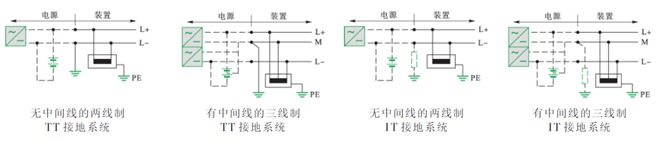 與交流配電系統(tǒng)一樣,直流配電系統(tǒng)的接地形式也分為TN、TT、IT,由于直流用電設(shè)備對(duì)供電電源要求有可能是負(fù)電源或正電源,因此配電系統(tǒng)中有兩條電源線的兩線制或增加一條中間導(dǎo)線(M線)的三線配電制。下圖3為配電系統(tǒng)常用的TT、IT接地形式的系統(tǒng)簡(jiǎn)圖。