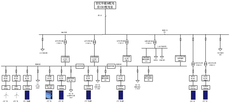 隨著分布式發(fā)電和儲(chǔ)能的大量應(yīng)用和直流負(fù)荷的快速增長(zhǎng),使得直流配電越來越受關(guān)注。直流配電系統(tǒng)將會(huì)成為未來配電技術(shù)的一個(gè)重要組成部分。2017年8月26日,國(guó)家863課題“高密度分布式能源接入直流混合微電網(wǎng)關(guān)鍵技術(shù)”示范工程在浙江上虞投入運(yùn)行,實(shí)現(xiàn)國(guó)內(nèi)首次交直流混合微電網(wǎng)用戶側(cè)運(yùn)行,工程改造或接入分布式光伏總?cè)萘?.4MW,2套5kW風(fēng)力發(fā)電系統(tǒng),1套250kW/800kWh鉛酸電池儲(chǔ)能系統(tǒng),1套交直流微電網(wǎng)功率變換與網(wǎng)架系統(tǒng),系統(tǒng)內(nèi)交流最高負(fù)荷約1.2MW,直流最高負(fù)荷約0.9MW。下圖為該工程拓?fù)鋱D。