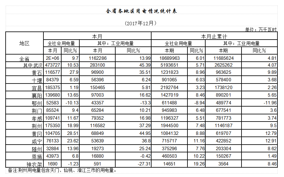 (五)全省各地區(qū)用電普遍增長(zhǎng),“一主兩副”城市增速穩(wěn)健。全省14個(gè)用電統(tǒng)計(jì)地區(qū)中,武漢等13個(gè)地區(qū)全社會(huì)用電同比增長(zhǎng),其中咸寧、恩施、神農(nóng)架林區(qū)3地全社會(huì)用電增幅在兩位數(shù)以上。各地工業(yè)用電基本與全社會(huì)用電同步增長(zhǎng),僅鄂州市受鋼鐵行業(yè)淘汰落后產(chǎn)能影響工業(yè)用電下降。“一主兩副”城市武漢、宜昌、襄陽(yáng)3市全社會(huì)用電量占到全省的47.16%,工業(yè)用電量占全省的44.63%,3市全社會(huì)和工業(yè)用電均增幅穩(wěn)健,有力促進(jìn)了全省用電的增長(zhǎng)。