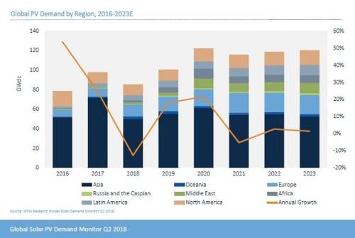 GTM Research最新的“全球太陽能需求監(jiān)測報告”預計2018年全球太陽能市場將下滑至85.2GW,原因是中國決定在5月底限制其兩個最大市場 - 公用事業(yè)規(guī)模和分布式發(fā)電(DG)。公用事業(yè)大幅超前計劃的市場過熱和補貼支付要求。