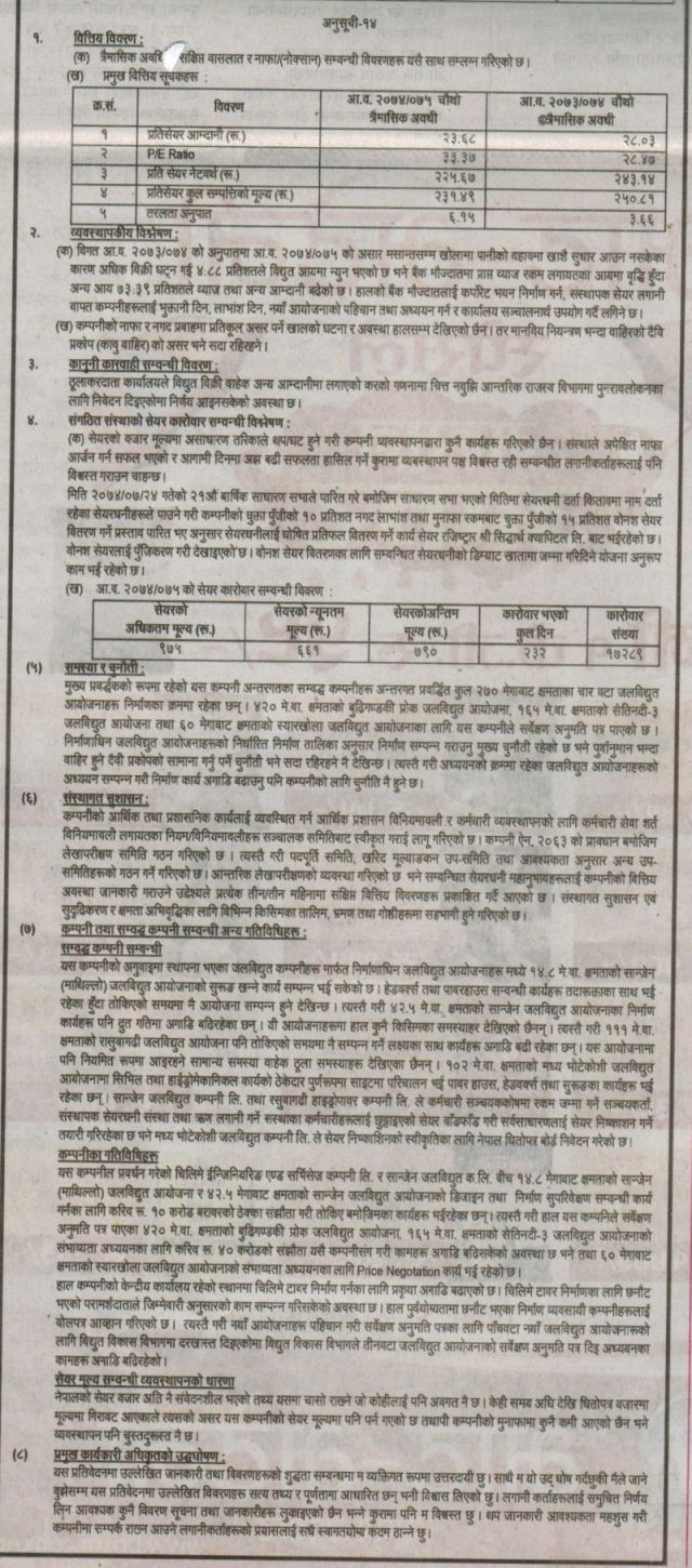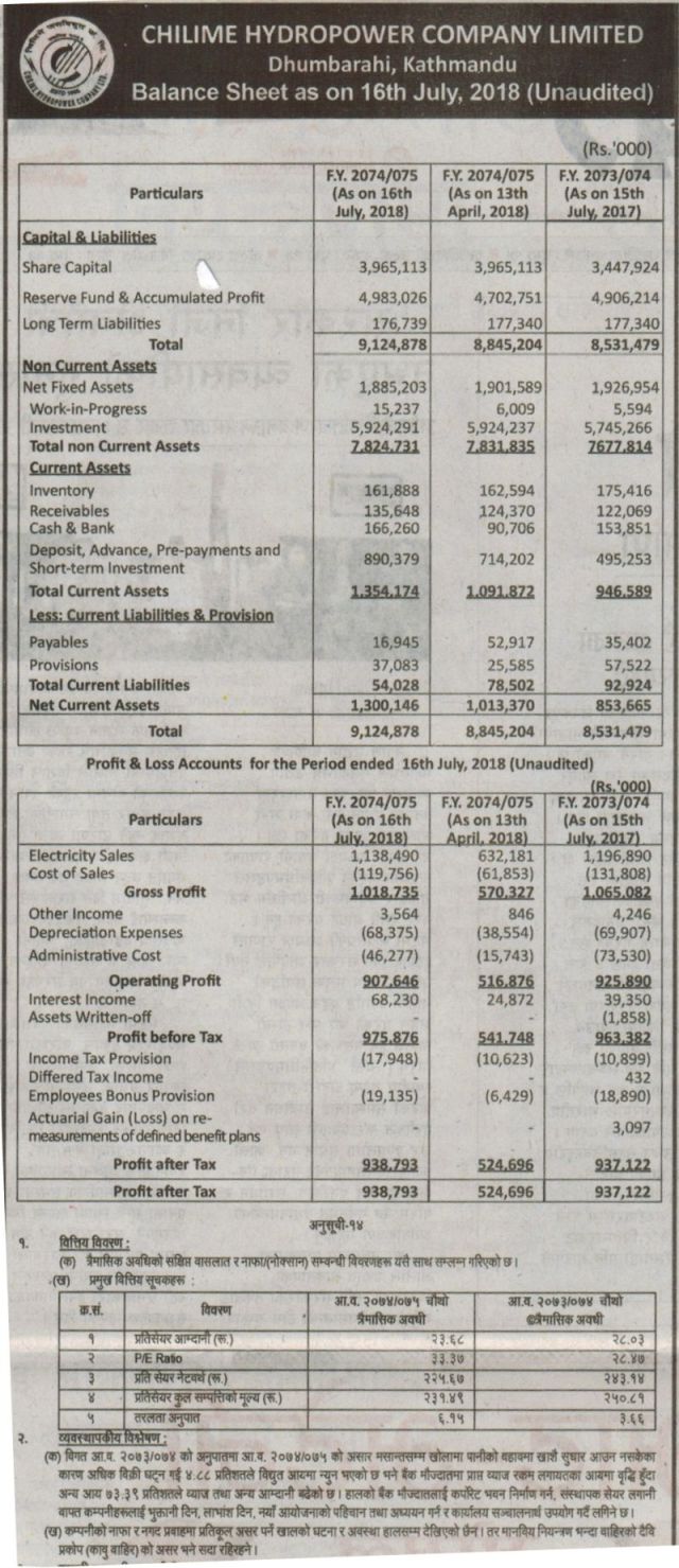 加德滿都(As)。Chillime水電公司已獲得盧比。93億賺取利潤。該利潤與之前的費用進(jìn)行比較。16萬71萬多。本公司已在上一期間收費。盈利93.7億美元。由于公司收入的增加,利潤增加了。利息收入增加73%至盧比。已達(dá)到6.6億。公司的盧比。已經(jīng)制造了10億1300萬。與早先的平均水平相比,這一收入低于4 87%。由于6月中旬水流量沒有改善,電力銷售下降。公司的收入收入 23位小數(shù)68,價格收入比率為33位小數(shù)37倍,凈利潤率為小數(shù)點后2.2位67。