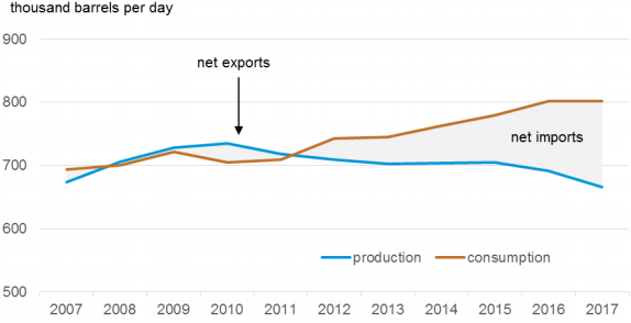 圖12:埃及年度石油及其他石油產(chǎn)品生產(chǎn),消費(fèi),凈出口和凈進(jìn)口(EIA,2018)
