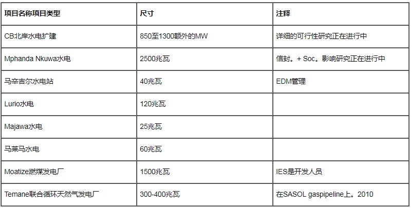 兩個(gè)直接項(xiàng)目是Cahora Bassa大壩和有爭議的Mphanda Nkuwa大壩(2500兆瓦)的850兆瓦(名義)擴(kuò)建。見下表。