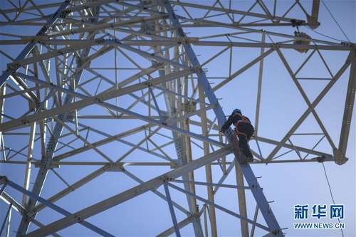 在五家渠750千伏變電站220千伏送出工程施工現場,工作人員在攀爬電力塔架(9月30日攝)。