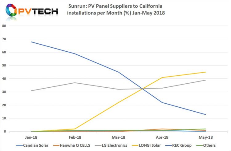 部署圖表(2018年1月至5月)顯示,LONGi Solar已成為Sunrun最大的高端產(chǎn)品。效率P型單PERC(鈍化發(fā)射器后電池)面板供應(yīng)商,占安裝量的45%。