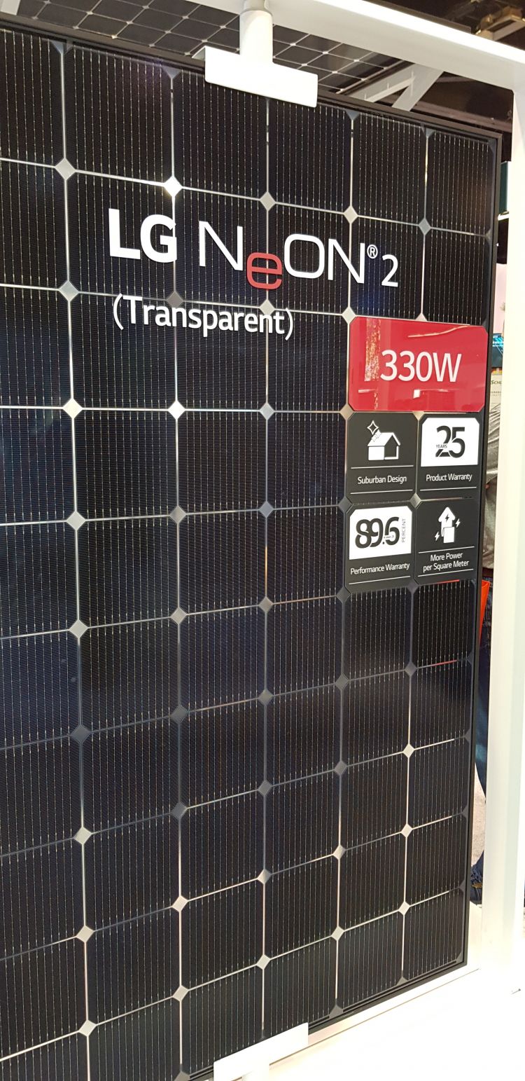 LG電子在SPI 2018上展示了其“NeON 2”系列面板,其中包括透明底片??,通過將屋頂顏色與細(xì)胞間距混合,改善了住宅系統(tǒng)的美觀。圖片:PV Tech
