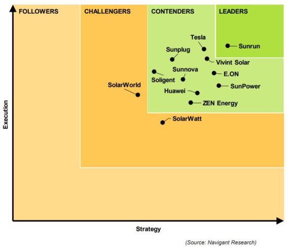 有幾家公司正在努力爭取這一領(lǐng)域的競爭,但根據(jù)Navigant Research自己的排行榜,只有一家公司符合Navigant要求被稱為領(lǐng)導(dǎo)者 - 美國住宅公司Sunrun的要求。