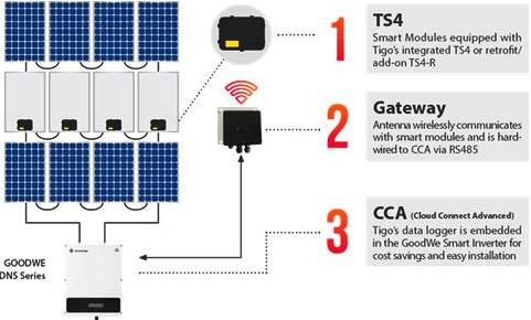 固德威聯(lián)合Tigo推出的此快速關斷型逆變器簡化的解決方案完全適用于復雜的系統(tǒng)設計和局部遮陽情況。TigoTS4平臺為固德威DNS和SDT逆變器提供了關機代碼,使逆變器遵從模塊級診斷,能最大化收集能源,兩者無縫協(xié)作。