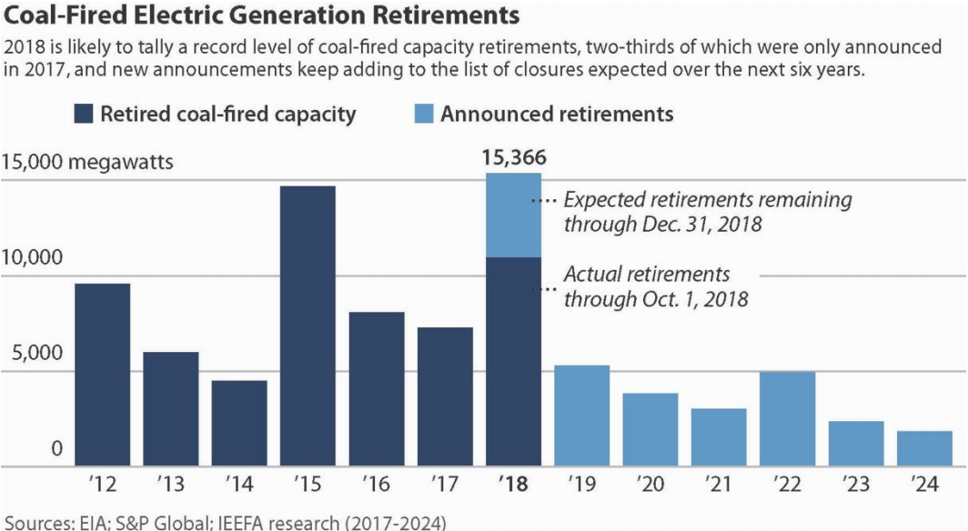 IEEFA預(yù)計2018年退休將“輕松”超過目前創(chuàng)下的14.7吉瓦煤炭退休記錄,目前創(chuàng)下2015年的煤炭退役記錄。美國仍有246吉瓦的煤炭在線產(chǎn)能,并宣布到2024年退役占該運營船隊的約15%。