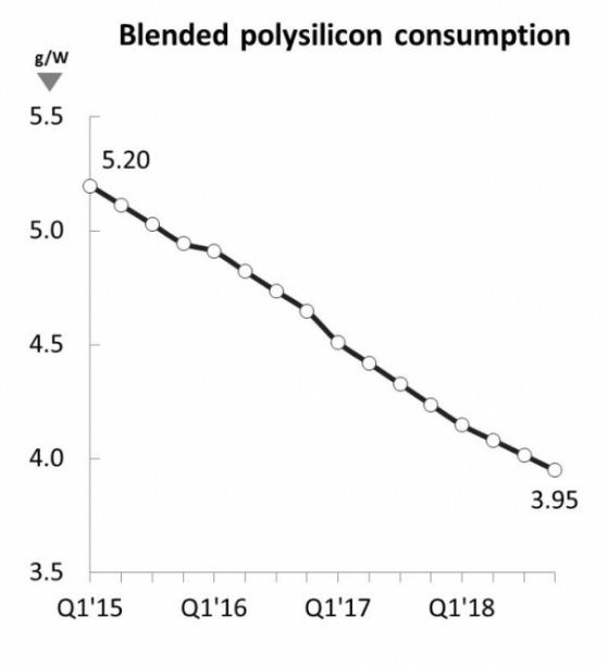 預計多晶硅消耗量在15年1季度和18年4季度之間下降了25%,在2018年結(jié)束時混合水平下降到3.9g/W。