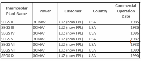 早在20世紀(jì)80年代初,首諾便為L(zhǎng)uz公司在美國(guó)加利福尼亞州Mojave沙漠相繼建成的9座槽式太陽能熱發(fā)電電站SEGSI~SEGSIX提供導(dǎo)熱油,SEGSI系列電站總裝機(jī)容量達(dá)35.38萬千瓦,為全球最早一批商業(yè)化光熱發(fā)電項(xiàng)目。此后,Therminol®VP-1被全球二十多家商業(yè)化槽式太陽能熱發(fā)電電站廣泛采用,首諾導(dǎo)熱油覆蓋的商業(yè)化槽式太陽能熱發(fā)電電站總裝機(jī)容量達(dá)1.4GW。