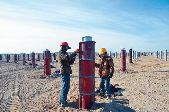 玉門鑫能鄭家沙窩5萬千瓦熔鹽塔式光熱發(fā)電項目建設(shè)現(xiàn)場。該項目總投資17.9億元,占地2.47平方公里,計劃建設(shè)總裝機容量5萬千瓦的熔鹽塔式光熱電站,建成后,年發(fā)電量可達2.02億千瓦時。