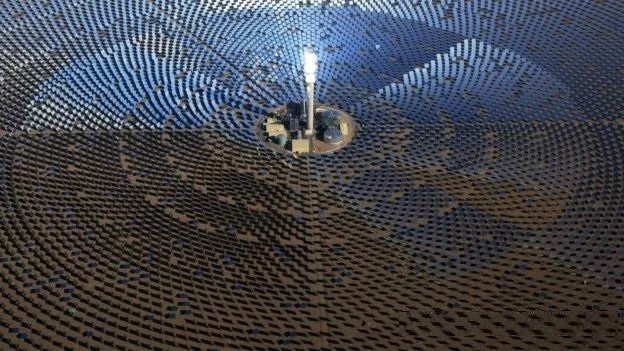 Aurora項目預(yù)計將為9 萬戶家庭供電,預(yù)計每年可生產(chǎn) 500GW的電力,排碳量也可減少200 萬噸。鏡場將布滿12,000 面塔式定日鏡,利用鏡子聚集太陽光至中央220米高的吸熱塔中,其內(nèi)部熔鹽(molten salt)將被加熱到攝氏565度。