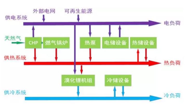 橫向來看依次是源網(wǎng)荷儲。源側(cè)包括常規(guī)的供電設(shè)備、CHP機組、燃氣鍋爐等設(shè)備,以及外部電網(wǎng)供電、可再生能源接入;網(wǎng)架分為冷熱電等傳輸系統(tǒng);荷側(cè)為園區(qū)內(nèi)部的電、熱、冷負荷;在儲能方面,不同能源子系統(tǒng)均有各自的儲能設(shè)備??v向來看依次是電、氣、熱、冷多能互補運行。不同的能源子系統(tǒng)分別用不同的顏色表示,多種能源轉(zhuǎn)化設(shè)備(熱泵、CHP、燃氣鍋爐、溴化鋰機組)將不同的能源子系統(tǒng)相耦合。園區(qū)內(nèi)部多種能源形式以虛擬電廠的形式組合在一起綜合運行,在保證電、熱、冷負荷可靠供應(yīng)的前提下,實現(xiàn)了能源的梯級利用,提高能效,降低用能成本。并且對于波動性很強的可再生能源而言,綜合能源系統(tǒng)具有更多的靈活性,促進了可再生能源的接納,進一步提高系統(tǒng)經(jīng)濟性。
