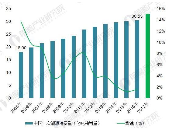 圖表5:2005-2017年中國大陸一次能源消費(fèi)總量及增速(單位:億噸油當(dāng)量,%)