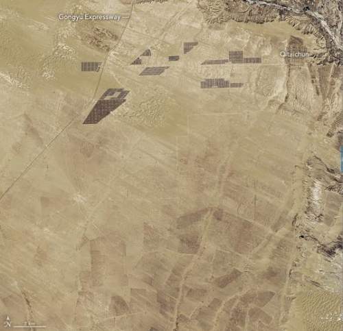 NASA(美國(guó)國(guó)家航空航天局)的衛(wèi)星圖像記錄下了龍羊峽光伏電站由一組組面板發(fā)展為連片的太陽(yáng)能發(fā)電站的過(guò)程。