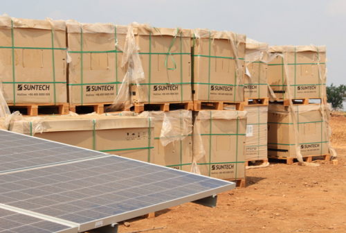 除了一些太陽能電池陣外,還有一大堆裝有尚德標(biāo)志的盒子。這些模塊正在休息,不久將在本月內(nèi)運送到英雄在該州建立的400兆瓦其他光伏容量。